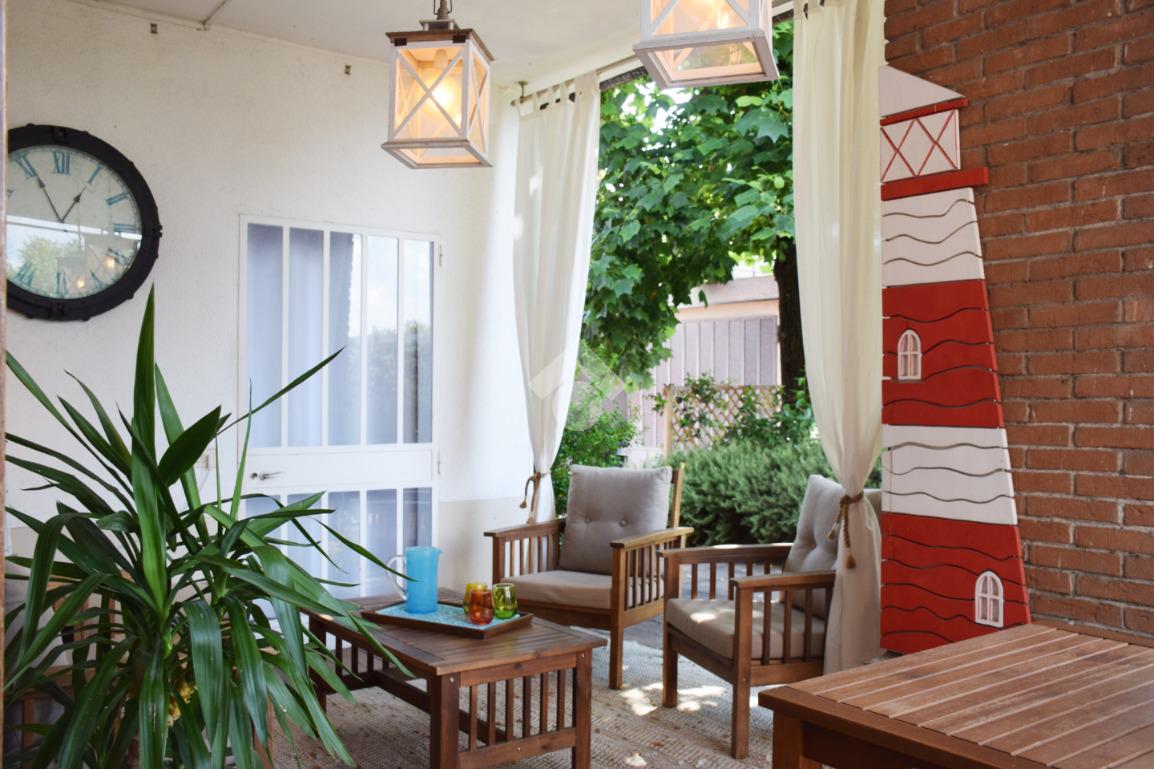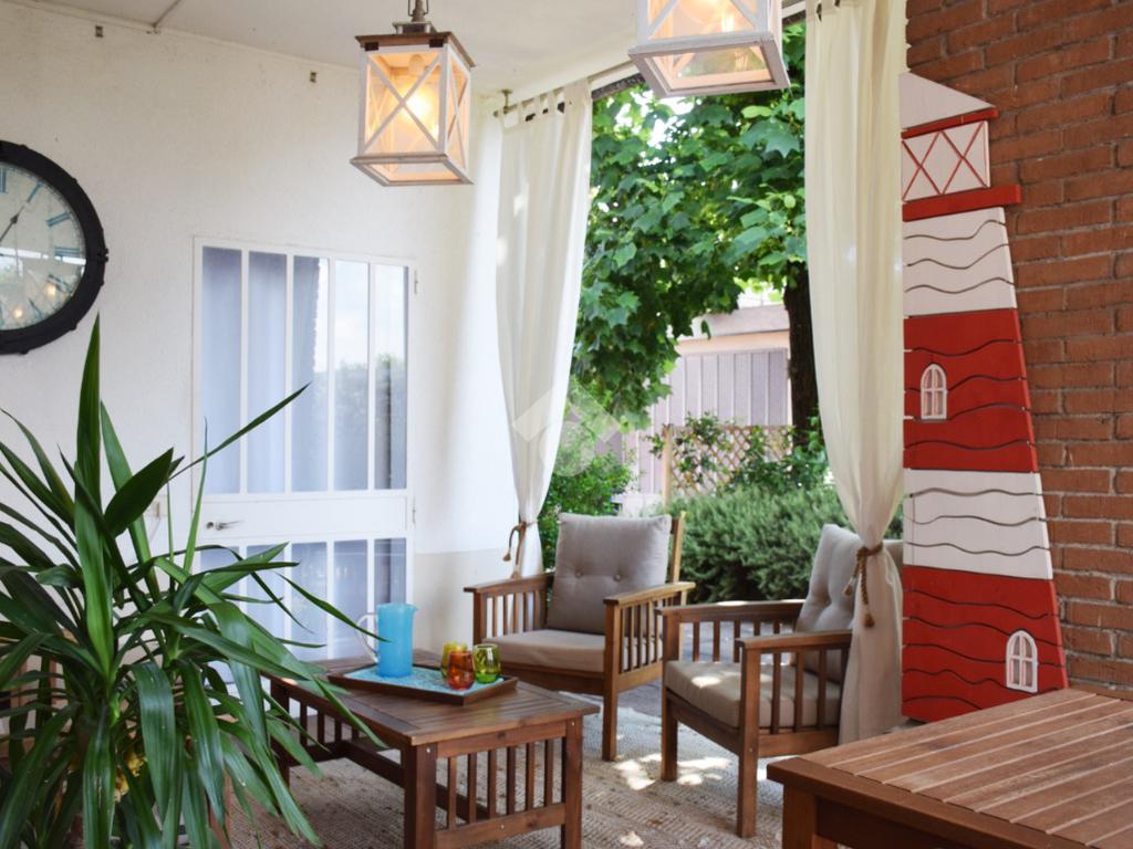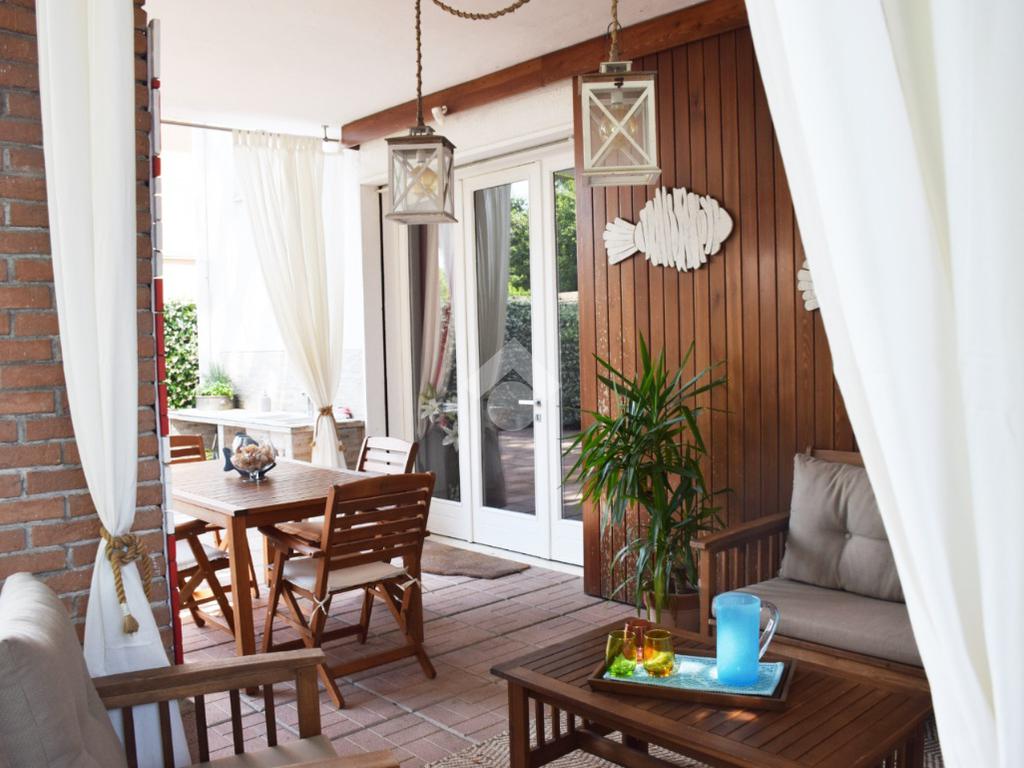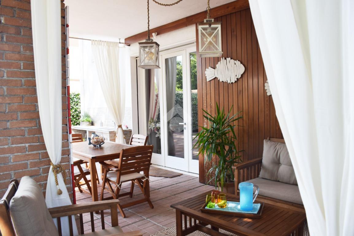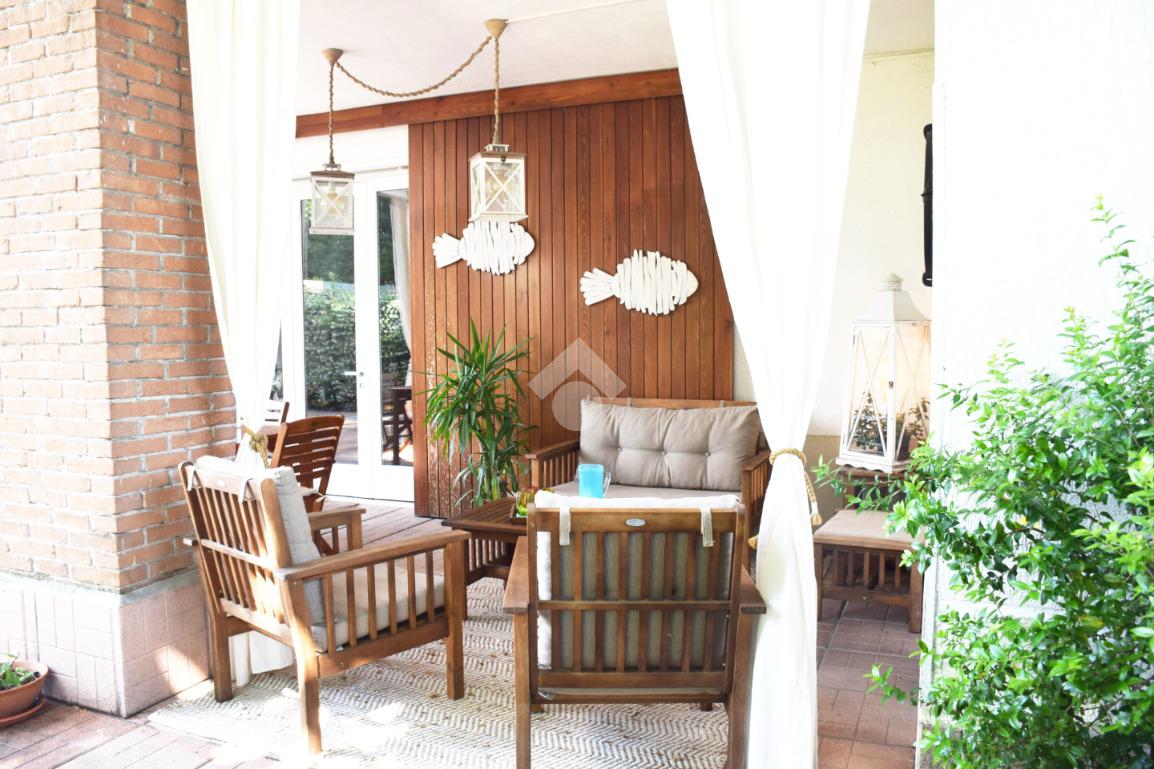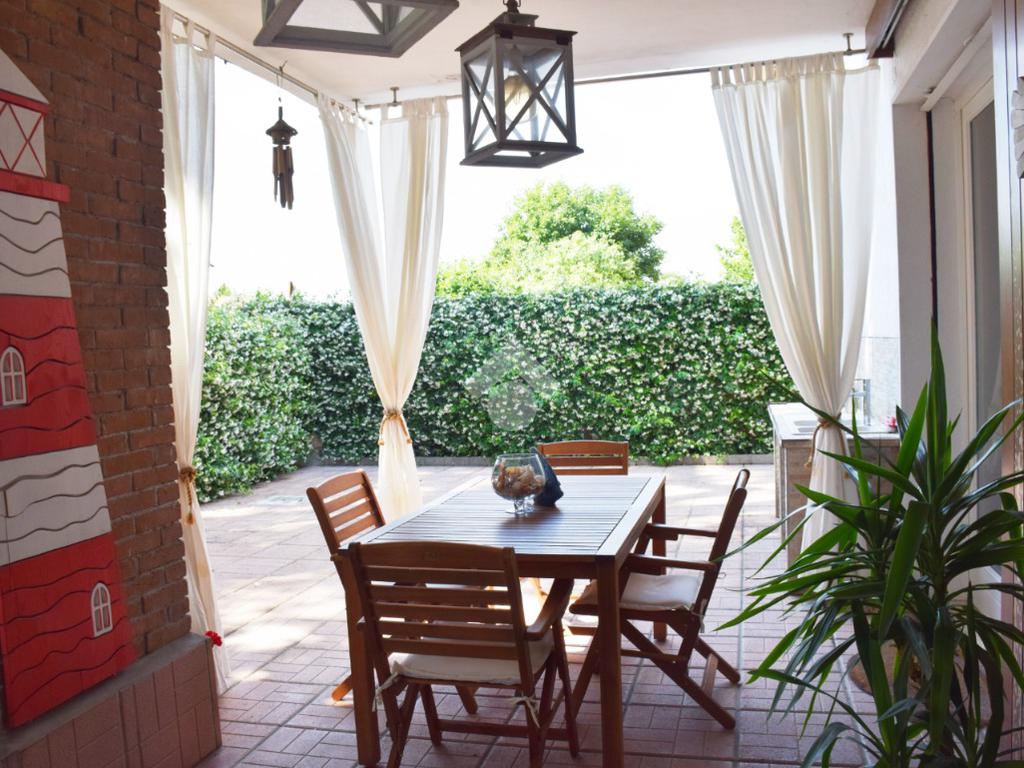 La zona giorno, accogliente e funzionale, gode di accesso diretto all'ampio giardino privato, finemente piantumato e completo di caratteristico portico.