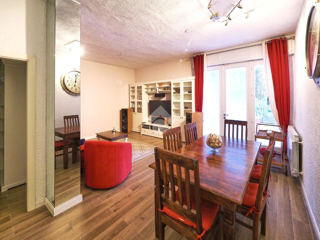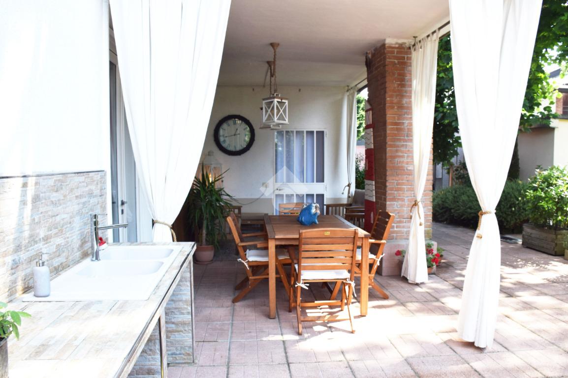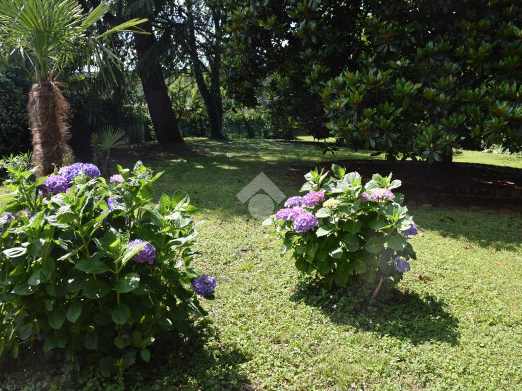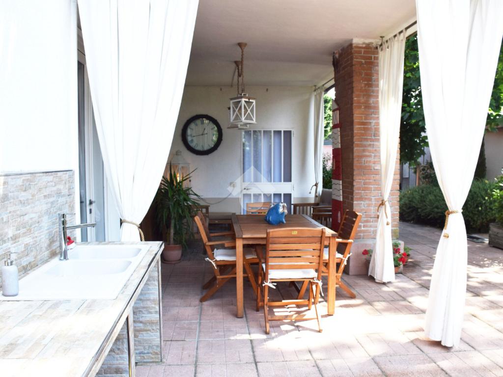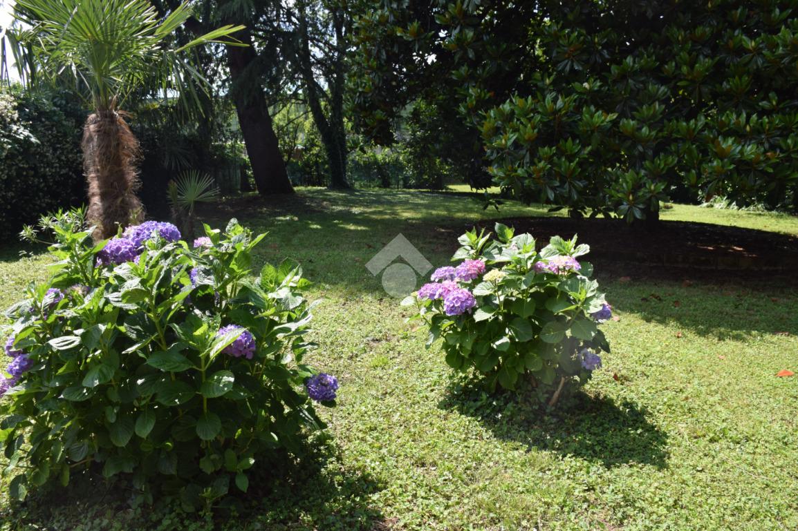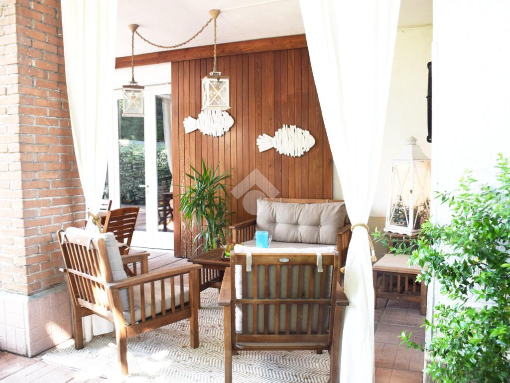 La zona giorno, accogliente e funzionale, gode di accesso diretto all'ampio giardino privato, finemente piantumato e completo di caratteristico portico.
